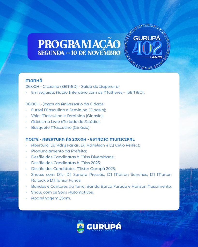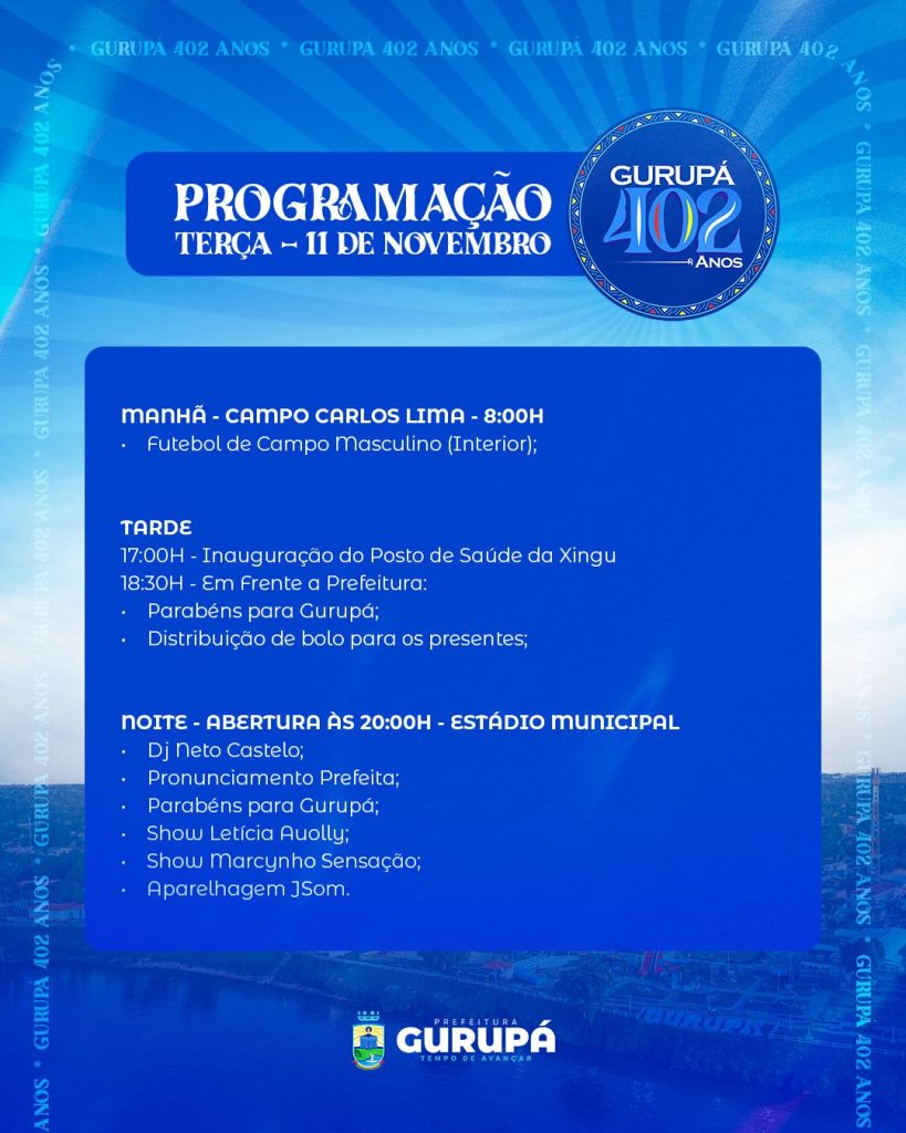 A Prefeitura Municipal de Gurupá tem a honra de convidar toda a população para comemorar os 402 anos de fundação do nosso querido município, uma das cidades mais tradicionais e importantes da região amazônica. São mais de quatro séculos de história, cultura, fé e trabalho de um povo que tem orgulho de suas raízes e olha com esperança para o futuro.