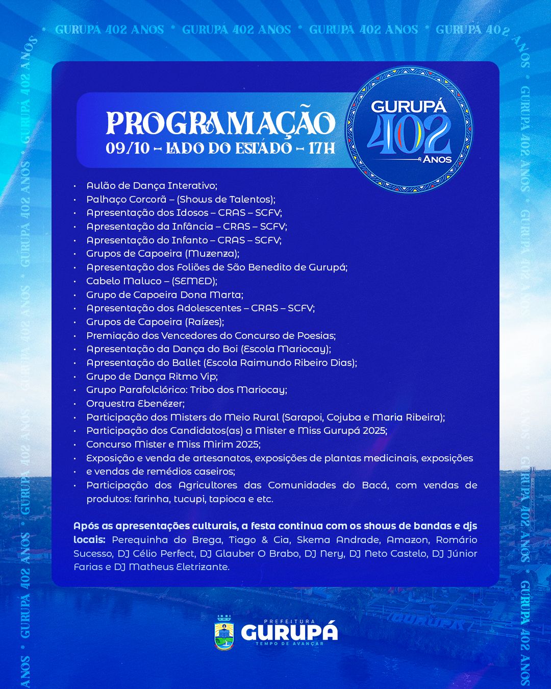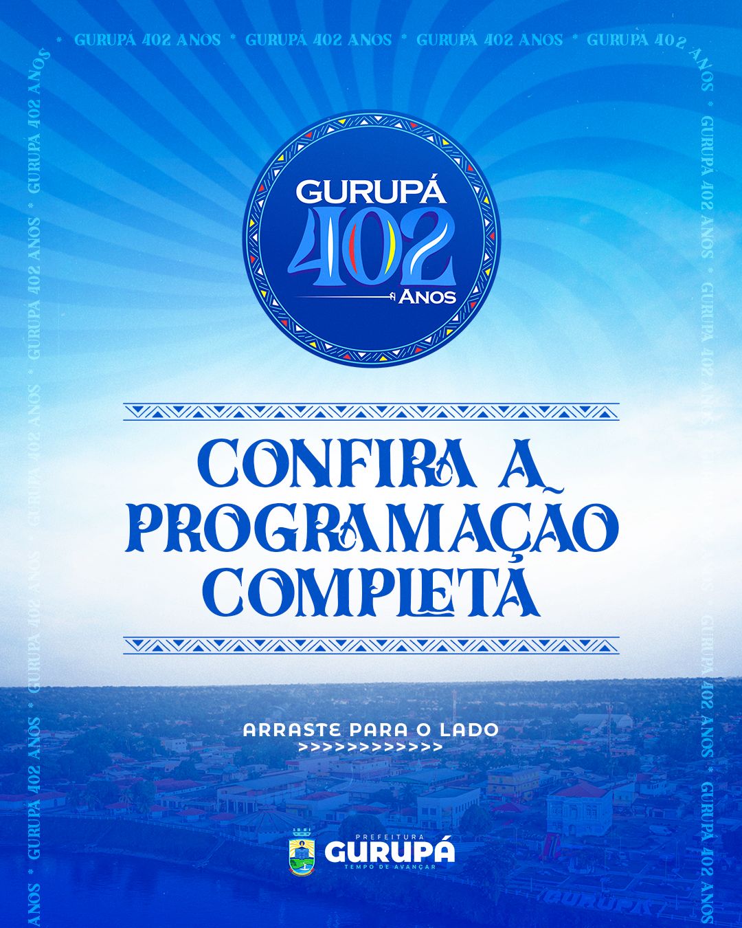 A Prefeitura Municipal de Gurupá tem a honra de convidar toda a população para comemorar os 402 anos de fundação do nosso querido município, uma das cidades mais tradicionais e importantes da região amazônica. São mais de quatro séculos de história, cultura, fé e trabalho de um povo que tem orgulho de suas raízes e olha com esperança para o futuro.